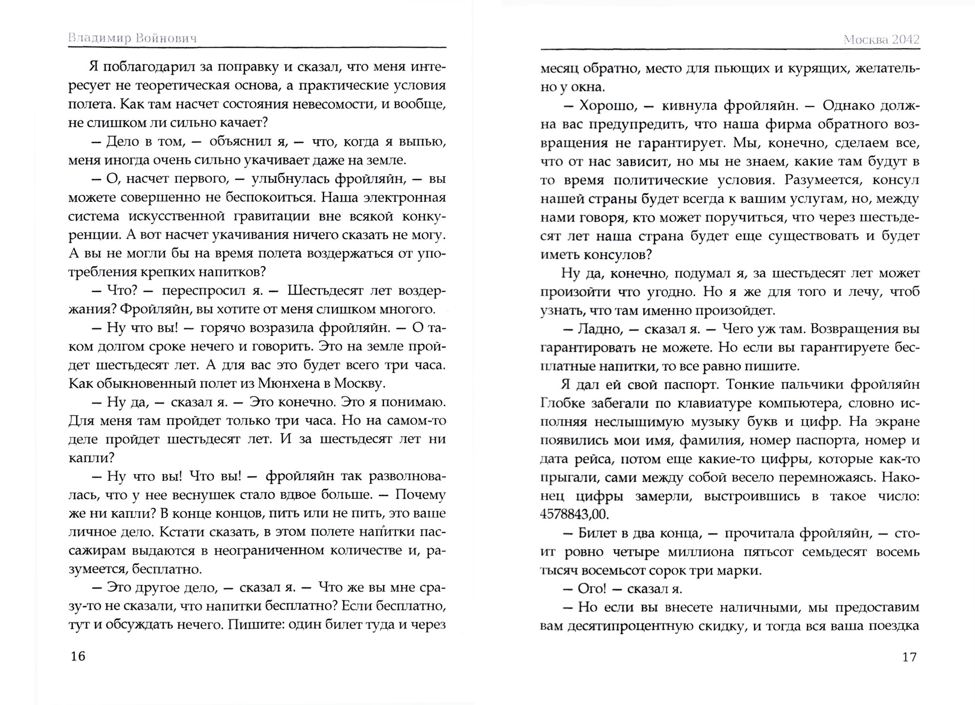 "Москва 2042" - сатирический роман-антиутопия, пародия, действие которой происходит в будущем, в обезумевшем "марксистском" мире Москорепа, так называется Москва середины XXI века. Советский писатель-эмигрант неожиданно получает возможность полететь в Москву 2042 года и в результате оказывается действующим лицом и организатором новой революции. 2042 год наступит через 20 лет, но кто знает, вдруг антиутопия Войновича стала романом-предсказанием?