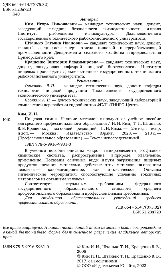 Пищевая химия. Наличие металлов в продуктах 2-е изд. испр. и доп. Учебное пособие для СПО (Ким Игорь Николаевич; Штанько Татьяна Ивановна; Кращенко Виктория Владимировна); ЮРАЙТ, 2019