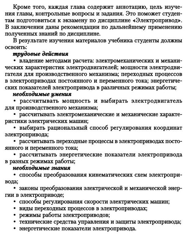 В учебнике изложены основы теории и применения электрического привода в сельском хозяйстве. Раскрыты механика и динамические свойства электропривода, даны сведения об аппаратуре управления и защиты, режимах работы электропривода, выборе мощности электродвигателей, рассмотрены вопросы определения энергетических показателей, описаны пути снижения потерь в электроприводе. Теоретический материал сопровождается примерами. Даны контрольные вопросы и задания к каждой главе.