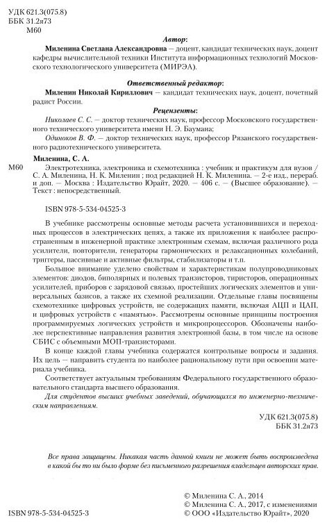 В учебнике рассмотрены основные методы расчета установившихся и переходных процессов в электрических цепях, а также их приложения к наиболее распространенным в инженерной практике электронным схемам. Большое внимание уделено свойствам и характеристикам полупроводниковых элементов, а также их схемной реализации. Отдельные главы посвящены схемотехнике цифровых устройств. Рассмотрены основные принципы построения программируемых логических устройств и микропроцессоров. Обозначены основные наиболее перспективные направления развития электронной базы. Для лучшего усвоения материала учебника каждая глава содержит контрольные вопросы и задания.
