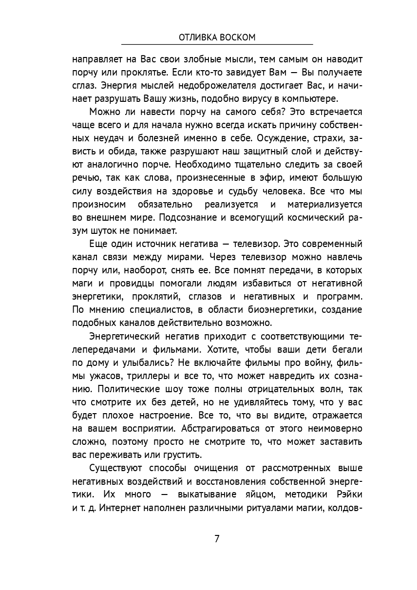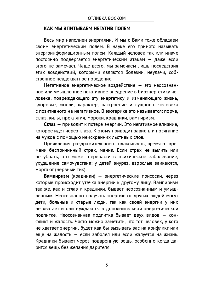 В книге представлен один из способов снятия с себя негатива самостоятельно – отливка воском. В наше неспокойное время о защите себя и своих близких от негативных воздействий люди задумываются всё чаще и чаще. Отливка на воск – это способ, которым пользовались еще наши прабабушки. Сейчас много написано об этом в Интернете. Я постаралась составить и систематизировать для вас эту информацию. Данная книга написана для читателей старше 18 лет.