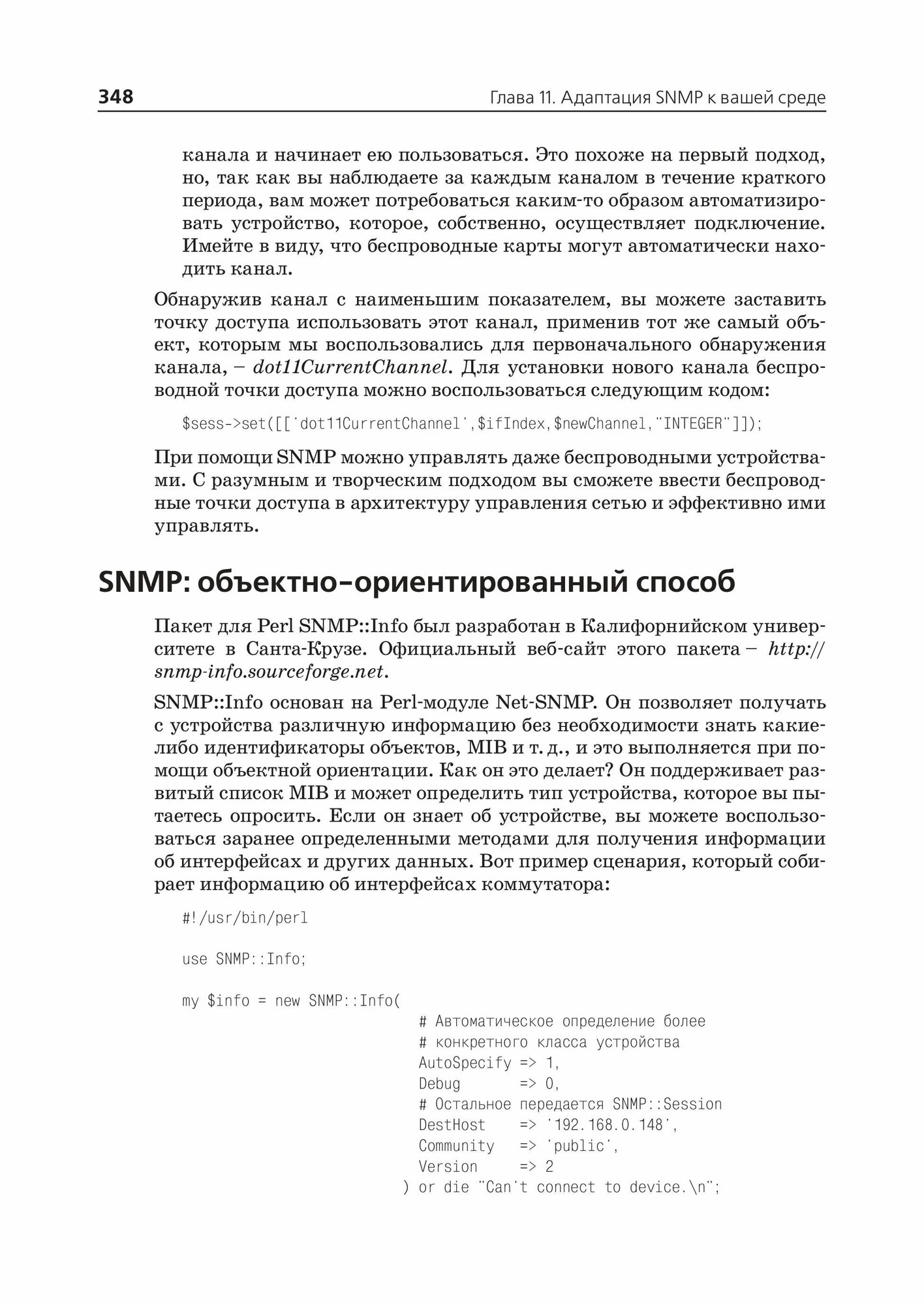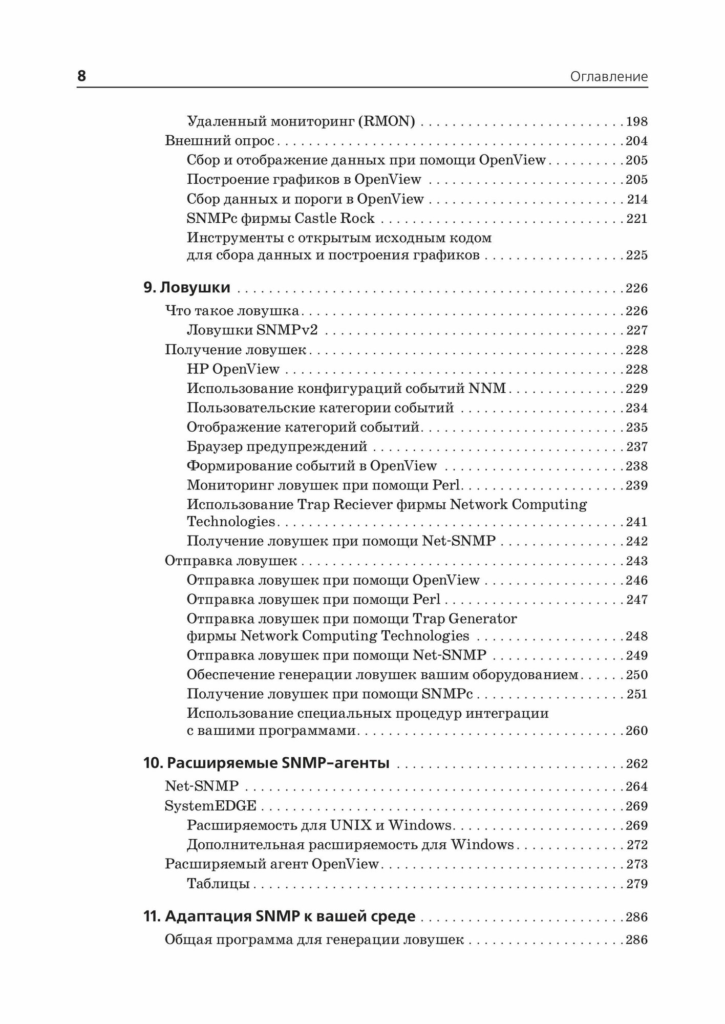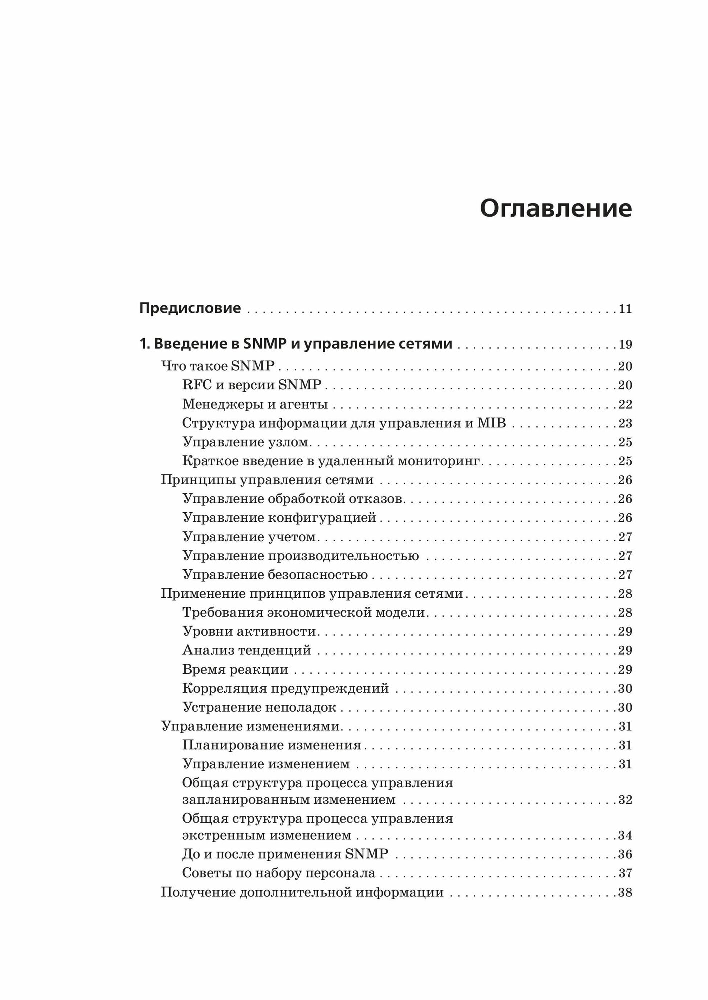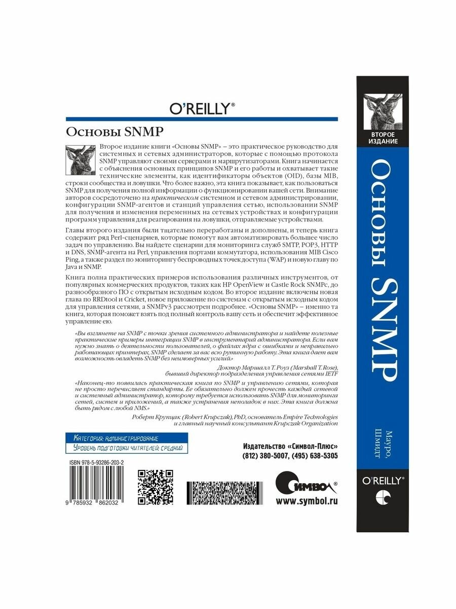 Второе издание книги «Основы SNMP» – это практическое руководство для системных и сетевых администраторов, которые пользуются протоколом SNMP для управления своими серверами и маршрутизаторами. Книга начинается с объяснения основных принципов SNMP и его работы и охватывает такие технические элементы, как идентификаторы объектов (OID), базы MIB, строки сообщества и ловушки. Что более важно, эта книга показывает вам, как пользоваться SNMP для получения полной информации о функционировании вашей сети. Внимание авторов сосредоточено на практическом системном и сетевом администрировании, конфигурации SNMP-агентов и станций управления сетью, использовании SNMP для получения и изменения переменных на сетевых устройствах и конфигурации программ управления для реагирования на ловушки, отправляемые устройствами. Главы второго издания были тщательно переработаны и дополнены, и теперь книга содержит ряд Perl-сценариев, которые помогут вам автоматизировать большее число задач по управлению. Вы найдете сценарии для мониторинга служб SMTP, POP3, HTTP и DNS, SNMP-агента на Perl, управления портами коммутатора, использования MIB Cisco Ping, а также раздел по мониторингу беспроводных точек доступа (WAP) и новую главу по Java и SNMP. Книга полна практических примеров использования различных инструментов, от популярных коммерческих продуктов, таких как HP OpenView и Castle Rock SNMPc, до разнообразного ПО с открытым исходным кодом.