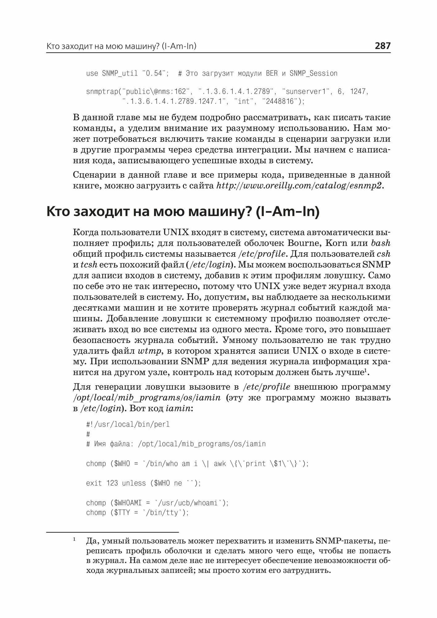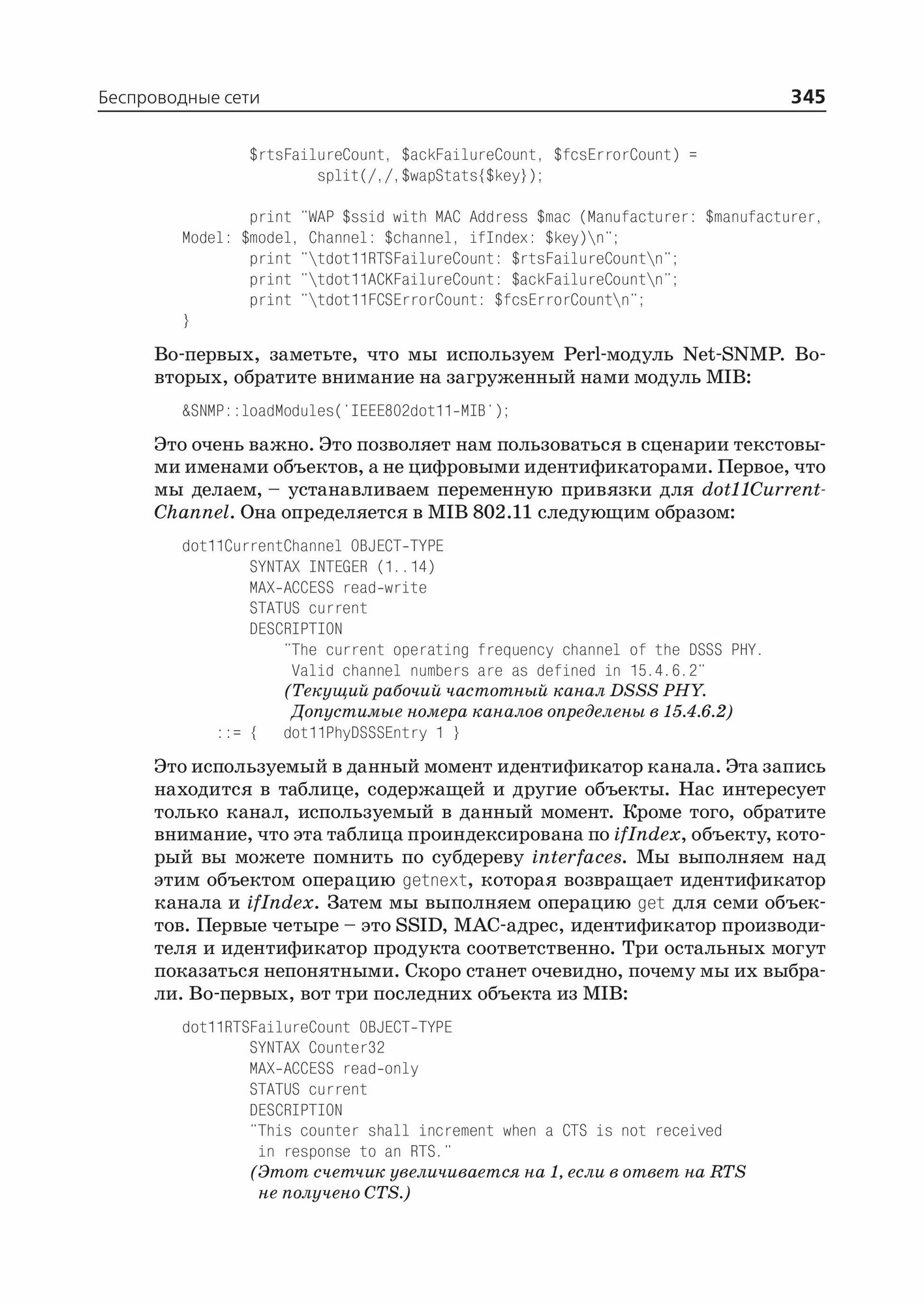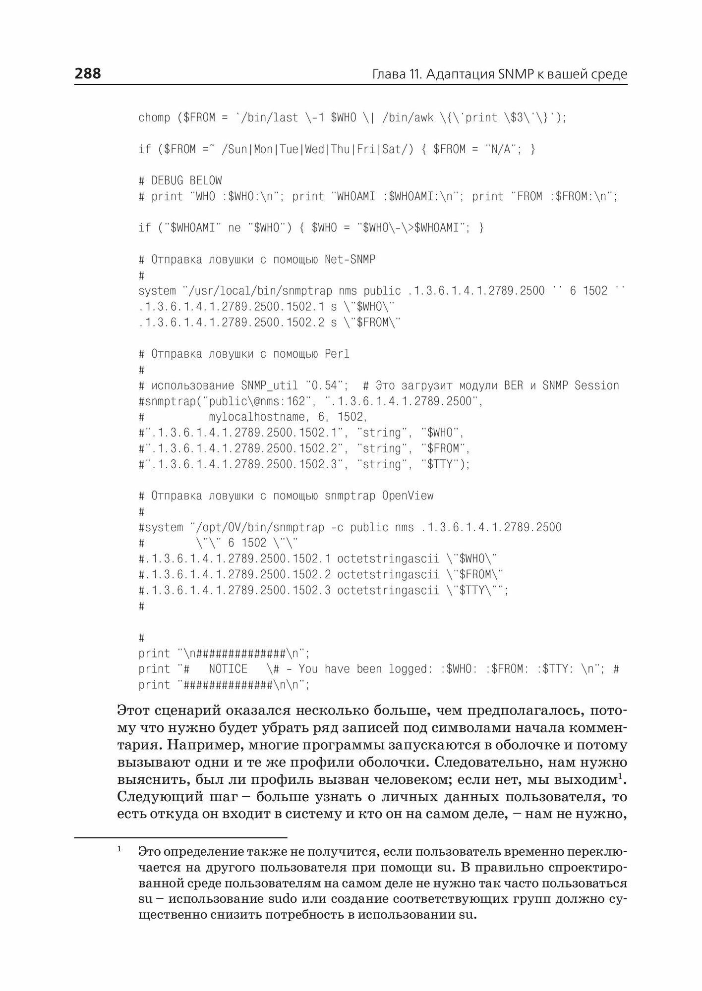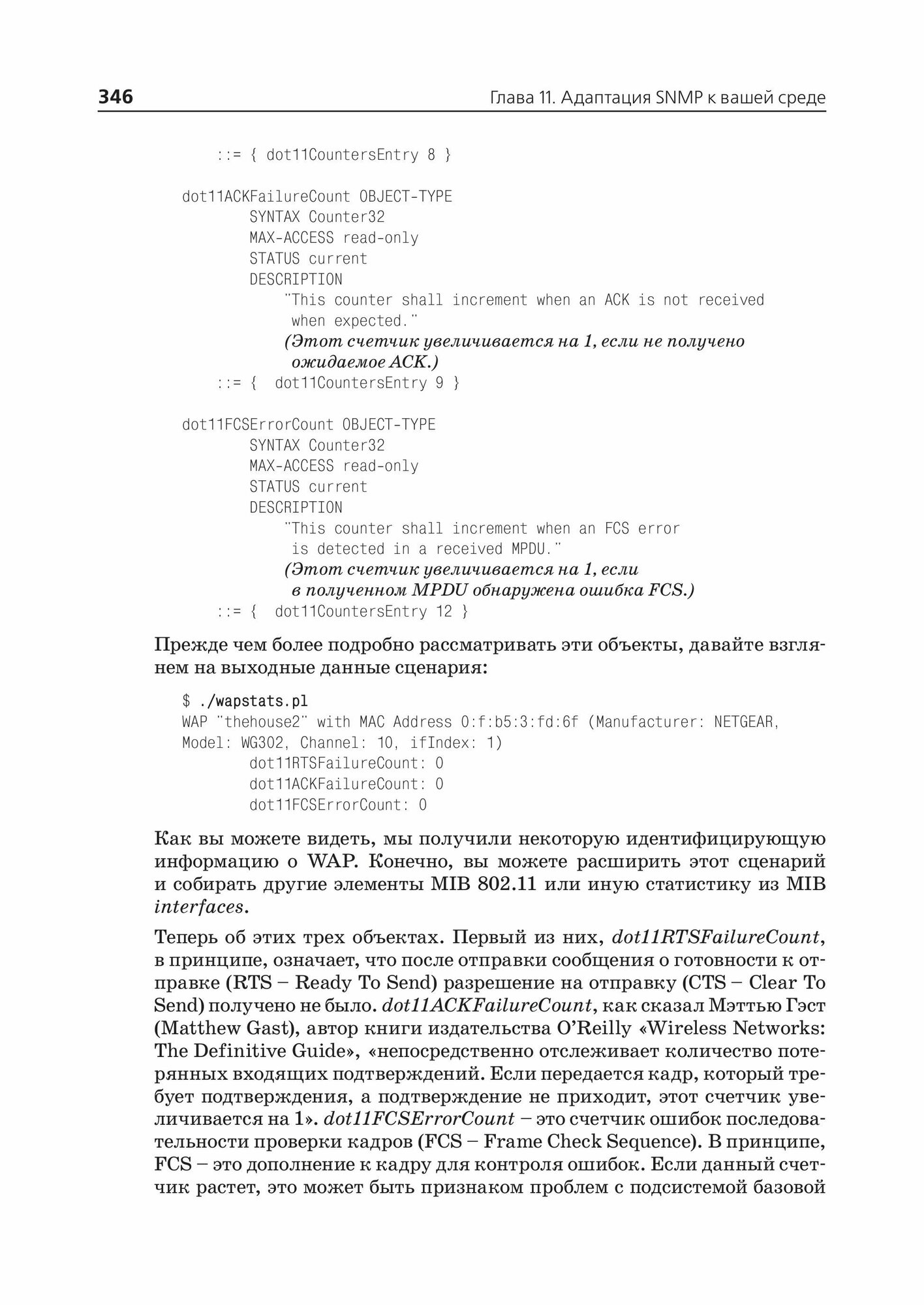 Второе издание книги «Основы SNMP» – это практическое руководство для системных и сетевых администраторов, которые пользуются протоколом SNMP для управления своими серверами и маршрутизаторами. Книга начинается с объяснения основных принципов SNMP и его работы и охватывает такие технические элементы, как идентификаторы объектов (OID), базы MIB, строки сообщества и ловушки. Что более важно, эта книга показывает вам, как пользоваться SNMP для получения полной информации о функционировании вашей сети. Внимание авторов сосредоточено на практическом системном и сетевом администрировании, конфигурации SNMP-агентов и станций управления сетью, использовании SNMP для получения и изменения переменных на сетевых устройствах и конфигурации программ управления для реагирования на ловушки, отправляемые устройствами. Главы второго издания были тщательно переработаны и дополнены, и теперь книга содержит ряд Perl-сценариев, которые помогут вам автоматизировать большее число задач по управлению. Вы найдете сценарии для мониторинга служб SMTP, POP3, HTTP и DNS, SNMP-агента на Perl, управления портами коммутатора, использования MIB Cisco Ping, а также раздел по мониторингу беспроводных точек доступа (WAP) и новую главу по Java и SNMP. Книга полна практических примеров использования различных инструментов, от популярных коммерческих продуктов, таких как HP OpenView и Castle Rock SNMPc, до разнообразного ПО с открытым исходным кодом.