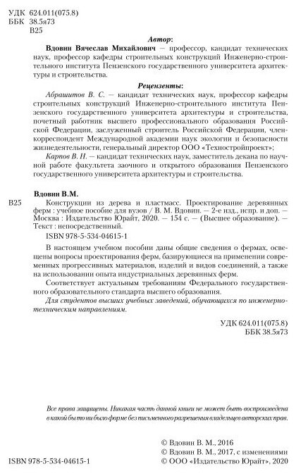 Конструкции из дерева и пластмасс. Проектирование деревянных ферм 2-е изд. испр. и доп. Учебное пособие для вузов (Вячеслав Михайлович Вдовин); ЮРАЙТ, 2017