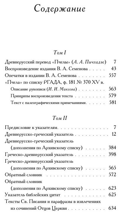 Предлагаемое издание представляет собой публикацию древнерусского перевода «Пчелы», одного из наиболее интересных памятников древнерусской письменности как в лингвистическом отношении, так и с точки зрения содержания. Текст публикуется по одному из древнейших сохранившихся списков XV в. из собрания РГАДА и сопровождается подробными палеографическими примечаниями. В издание включено воспроизведение текста «Пчелы» по ставшему ныне раритетным изданию В.А.Семенова, в котором древнерусский текст приводится параллельно с греческим. Издание снабжено двумя указателями к публикации Семенова русско-греческим и греческо-русским, а также обратным словником. Русско-греческий указатель содержит все встретившиеся в памятнике словоформы с их грамматической характеристикой и греческим соответствием.