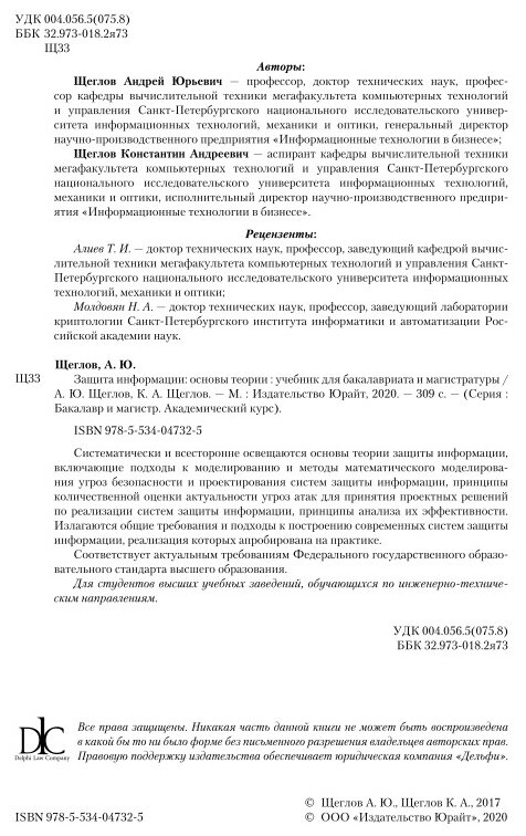 Защита информации: основы теории. Учебник для бакалавриата и магистратуры (Щеглов Андрей Юрьевич, Щеглов Константин Андреевич); ЮРАЙТ, 2022