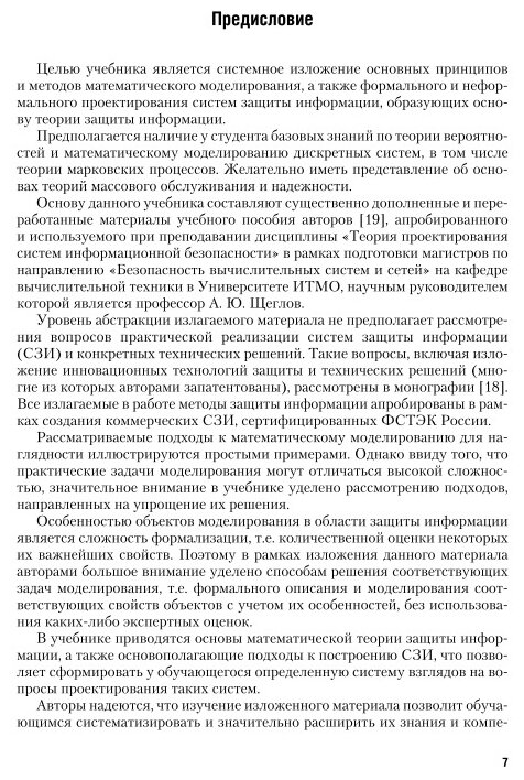 Цель учебника системное изложение основных принципов и методов математического моделирования, а также формального и неформального проектирования систем защиты информации, образующих основу теории защиты информации. В учебнике приводятся основы математической теории защиты инфомации, а также основополагающие подходы к построению СЗИ, что позволяет сформировать у обучающегося определенную систему взглядов на вопросы проектирования таких систем. Рассматриваемые в книге подходы к математическому моделированию для наглядности иллюстрируются простыми примерами.