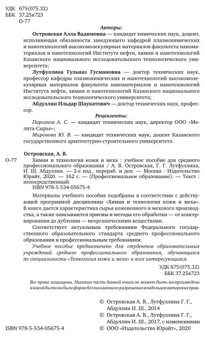 Химия и технология кожи и меха 2-е изд. пер. и доп. Учебное пособие для СПО (Островская Алла Вадиовна; Лутфуллина Гульназ Гусмановна; Абдуллин Ильдар Шаукатович); ЮРАЙТ, 2019
