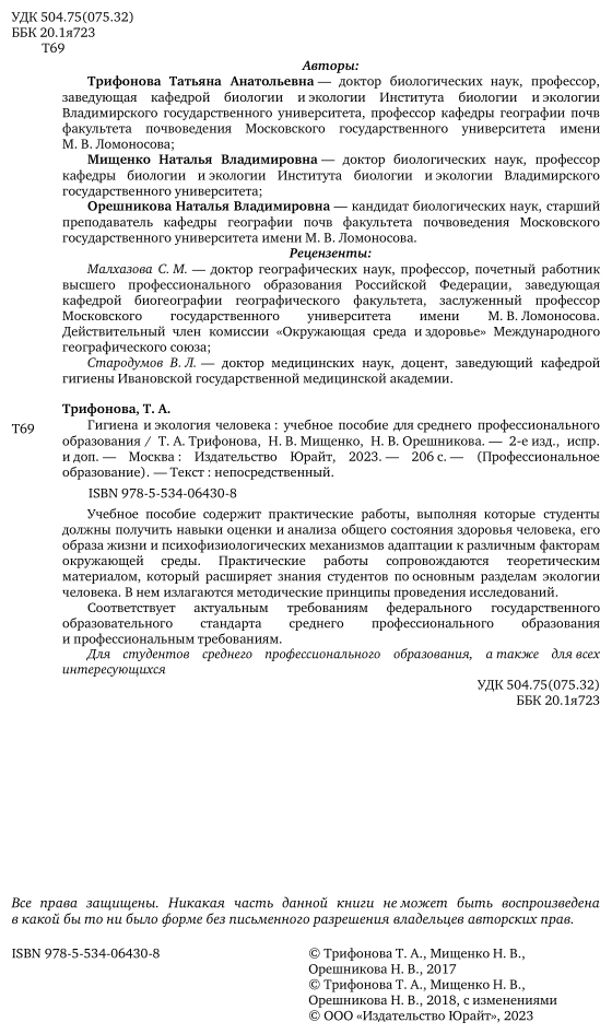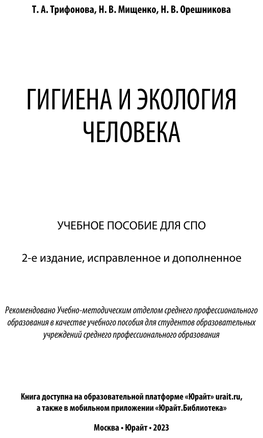 Гигиена и экология человека 2-е изд. испр. и доп. Учебное пособие для СПО (Мищенко Наталья Владимировна; Орешникова Наталья Владимировна; Трифонова Татьяна Анатольевна); ЮРАЙТ, 2019