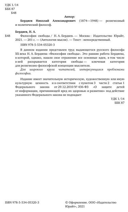Книга: Философия свободы (Николай Бердяев); ЮРАЙТ, 2017