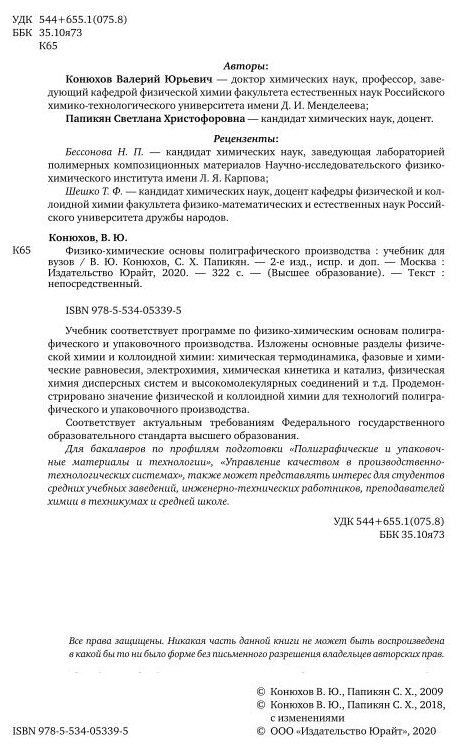 Физико-химические основы полиграфического производства 2-е изд. испр. и доп. Учебник для прикладного бакалавриата (Конюхов Валерий Юрьевич, Папикян Светлана Христофоровна); ЮРАЙТ, 2022