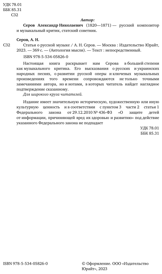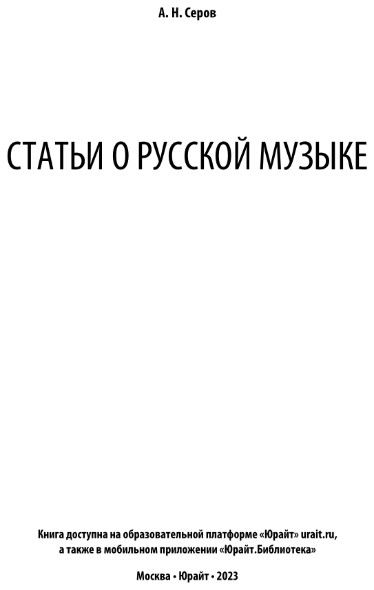 Книга: Статьи о русской музыке (Александр Николаевич Серов); ЮРАЙТ, 2018