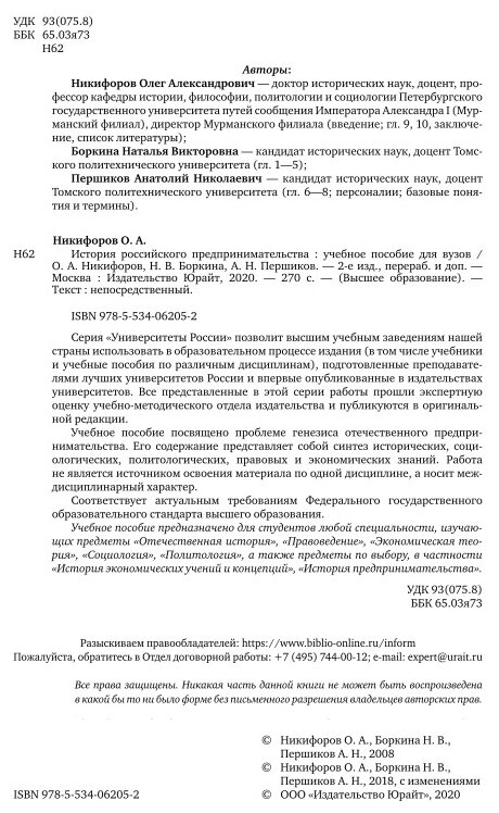 Серия «Университеты России» позволит высшим учебным заведениям нашей страны использовать в образовательном процессе издания (в том числе учебники и учебные пособия по различным дисциплинам), подготовленные преподавателями лучших университетов России и впервые опубликованные в издательствах университетов. Все представленные в этой серии работы прошли экспертную оценку учебно-методического отдела издательства и публикуются в оригинальной редакции. Учебное пособие посвящено проблеме генезиса отечественного предпринимательства. Его содержание представляет собой синтез исторических, социологических, политологических, правовых и экономических знаний. Работа не является источником освоения материала по одной дисциплине, а носит междисциплинарный характер.