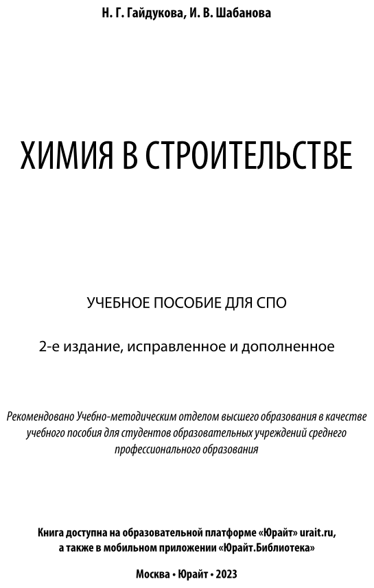 Химия в строительстве 2-е изд. испр. и доп. Учебное пособие для СПО (Гайдукова Нина Георгиевна; Шабанова Ирина Вячеславовна); ЮРАЙТ, 2019