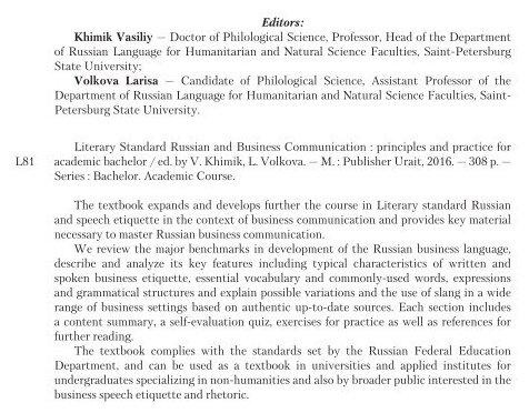 Учебник предлагает широкий подход к понятию «деловое общение»: это речевое обеспечение не только бизнеса, но и любой профессиональной деятельности, внеслужебных занятий, социальных контактов и т.д. Издание содержит необходимый объем информации, который позволит учащемуся разобраться в основных понятиях речевой коммуникации: язык и его функции, культура речи и речевая культура, стили и жанры общения, виды и правила деловой переписки, «секреты» делового красноречия, речевое поведение предпринимателя и жаргон чиновника. Читатель узнает, каким нормам подчиняется деловой язык, как правильно и эффективно общаться в деловой сфере, чем отличаются заявление от коммюнике, автобиография от резюме, что значит этикет делового письма, как подготовиться к публичному выступлению и многое другое.