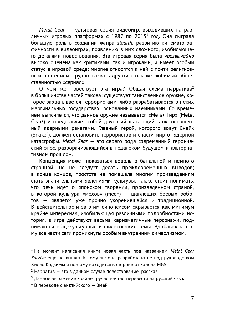 METAL GEAR – это совершенно особая видеоигровая сага. Это культовая игровая серия с историей, развивавшейся на протяжении четырех десятилетий. Это увлекательное повествование с симпатичными действующими лицами. Это эпическая история с глубоким идейным содержанием.Эта книга, являющаяся результатом огромного исследования и большой интеллектуальной работы, убедительно доказывает, что METAL GEAR SOLID – это величайшее творение игровой индустрии.
