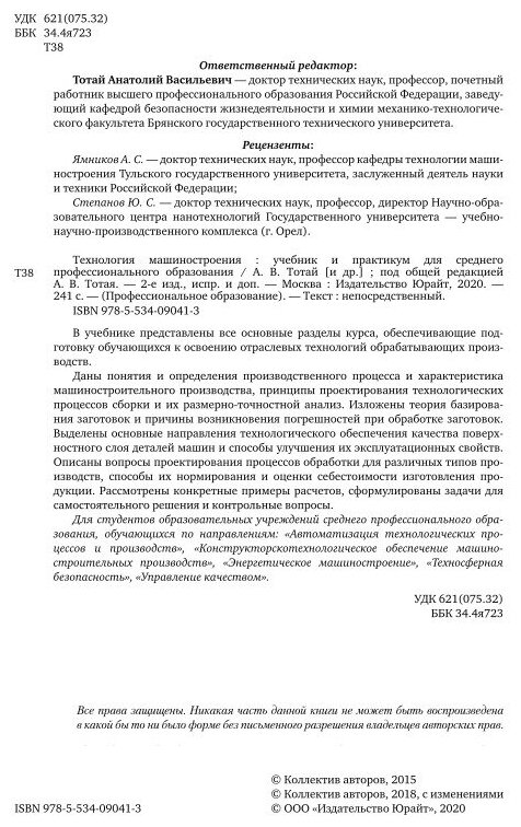 Технология машиностроения 2-е изд. испр. и доп. Учебник и практикум для СПО (Тотай Анатолий Васильевич; Прокофьев Александр Николаевич; Горленко Олег Александрович; Федонин Олег Николаевич; Бишутин Сергей Геннадьевич); ЮРАЙТ, 2019