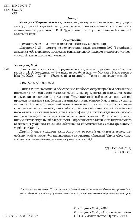 Психология интеллекта. Парадоксы исследования 3-е изд. пер. и доп. Учебное пособие для бакалавриата и магистратуры (Марина Александровна Холодная); ЮРАЙТ, 2019