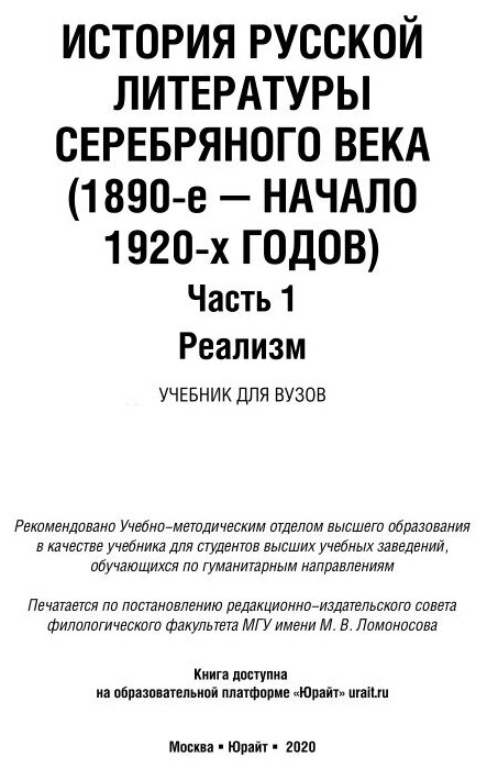 История русской литературы серебряного века (1890-е – начало 1920-х годов) в 3 ч. Часть 1. Реализм. Учебник для бакалавриата и магистратуры (Ничипоров Илья Борисович; Леденев Александр Владимирович; Холиков Алексей Александрович; Авраменко Альберт Петрович; Полонский Вадим Владимирович; Терехина Вера Николаевна; Кротова Дарья Владимировна; Толкачева Елена Владимировна; Глуховская Елена Александровна; Демиденко Елена Александровна; Зубарева Елена Юрьевна; Колобаева Лидия Андреевна; Кихней Любовь Геннадьевна; Михайлова Мария Викторовна; Руденко Мария Сергеевна; Кольцова Наталья Зиновьевна; Солнцева Наталья Михайловна; Пинаев Сергей Михайлович); ЮРАЙТ, 2019