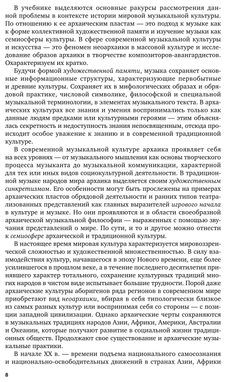 Книга является первым для музыкальных вузов и вузов искусств, музыкальных училищ и колледжей искусств – учебником, в котором архаика рассматривается как феномен мировой музыкальной культуры, проявляющийся на всех ее уровнях – от первобытной звуковой практики и традиционной музыки народов мира до современной массовой культуры и композиторского творчества.
