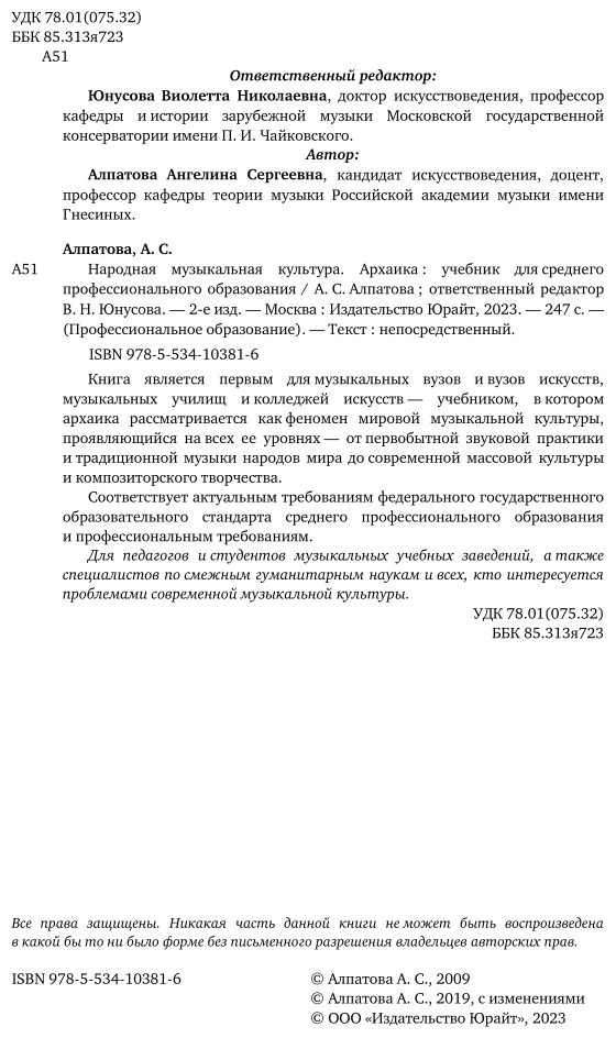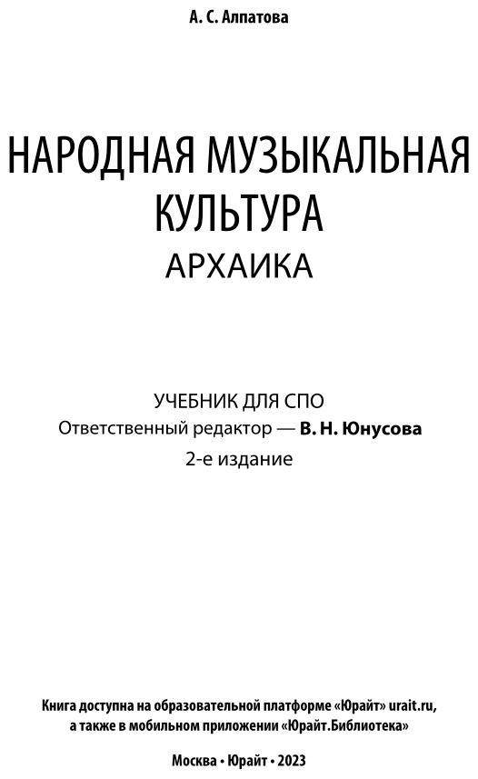 Народная музыкальная культура. Архаика 2-е изд. Учебник для СПО (Алпатова Ангелина Сергеевна; Юнусова Виолетта Николаевна); ЮРАЙТ, 2019