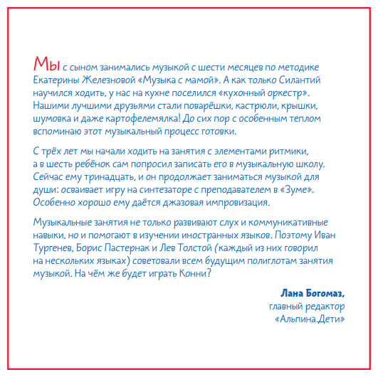 Дом Конни превратился в настоящий концертный зал! С утра до вечера там слышатся разные звуки. А всё потому, что Конни ходит в музыкальную школу и дома учит новые мелодии. Теперь она умеет играть на кастрюлях, сковородках и даже половниках! Но ей нужен настоящий музыкальный инструмент... На чём же будет играть Конни