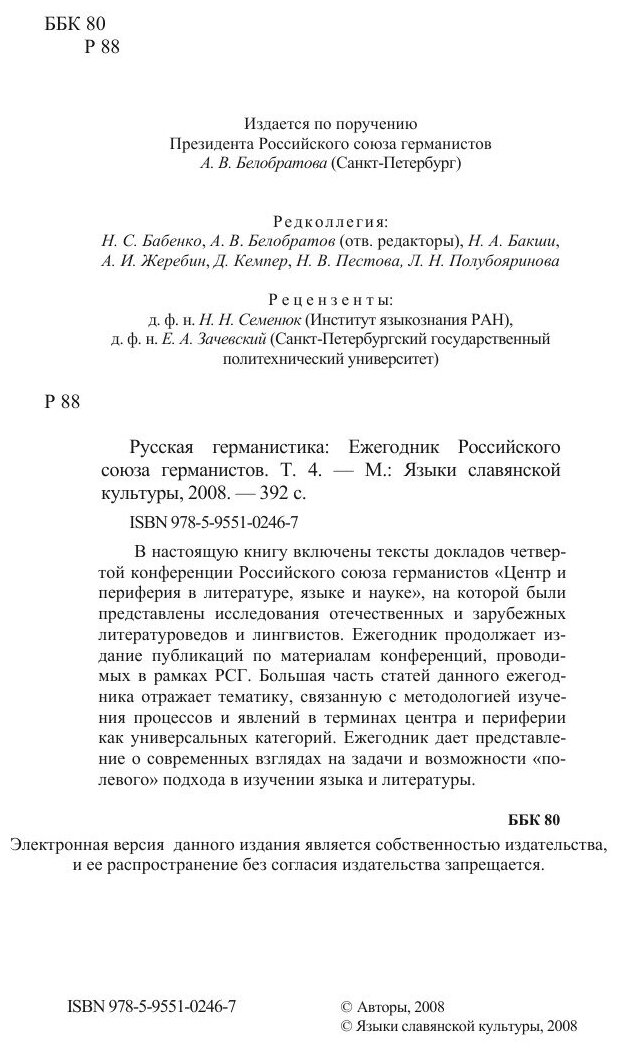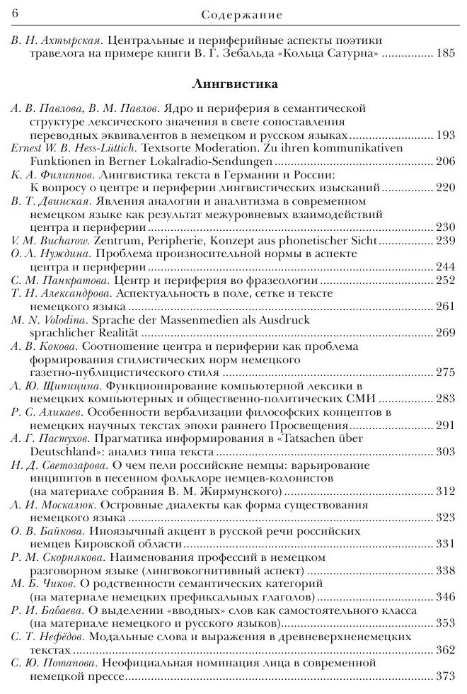 В настоящую книгу включены тексты докладов четвертой конференции Российского союза германистов «Центр и периферия в литературе, языке и науке», на которой были представлены исследования отечественных и зарубежных литературоведов и лингвистов. Ежегодник продолжает издание публикаций по материалам конференций, проводимых в рамках РСГ. Большая часть статей данного ежегодника отражает тематику, связанную с методологией изучения процессов и явлений в терминах центра и периферии как универсальных категорий. Ежегодник дает представление о современных взглядах на задачи и возможности «полевого» подхода в изучении языка и литературы.
