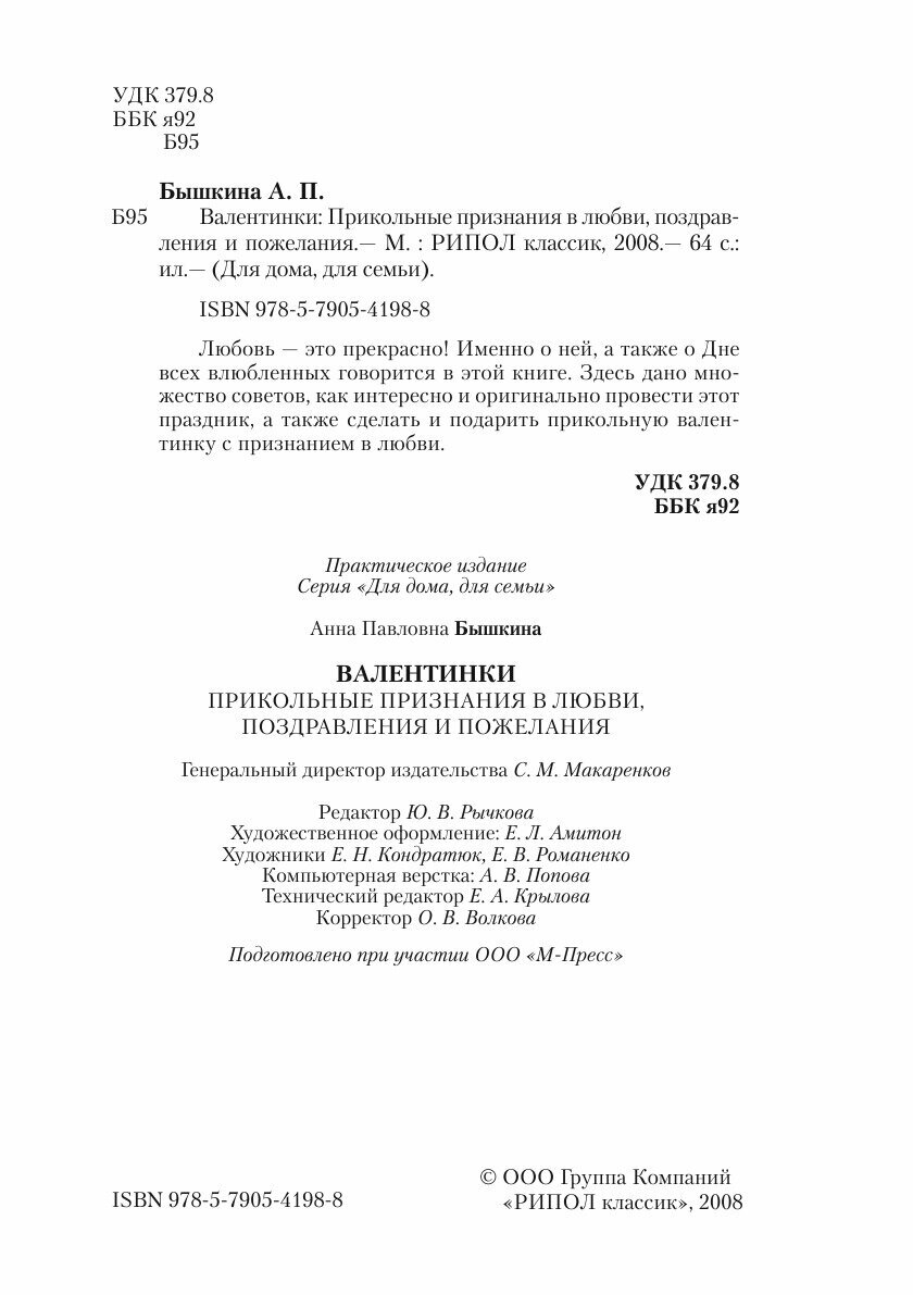 Сервис сравнения цен СкидкаГИД предлагает сравнить цены на товар «Книга: Валентинки: Прикольные признания в любви поздравления и пожелания (Анна Павловна Бышкина); РИПОЛ Классик, 2008»