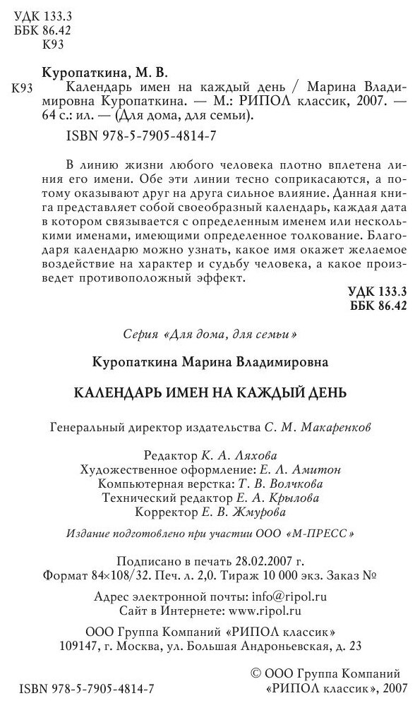 Календарь имен на каждый день (Марина Куропаткина); РИПОЛ Классик, 2007