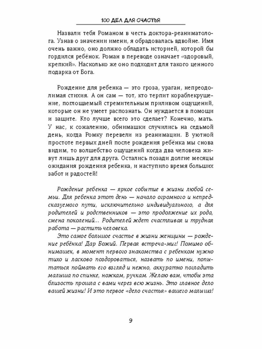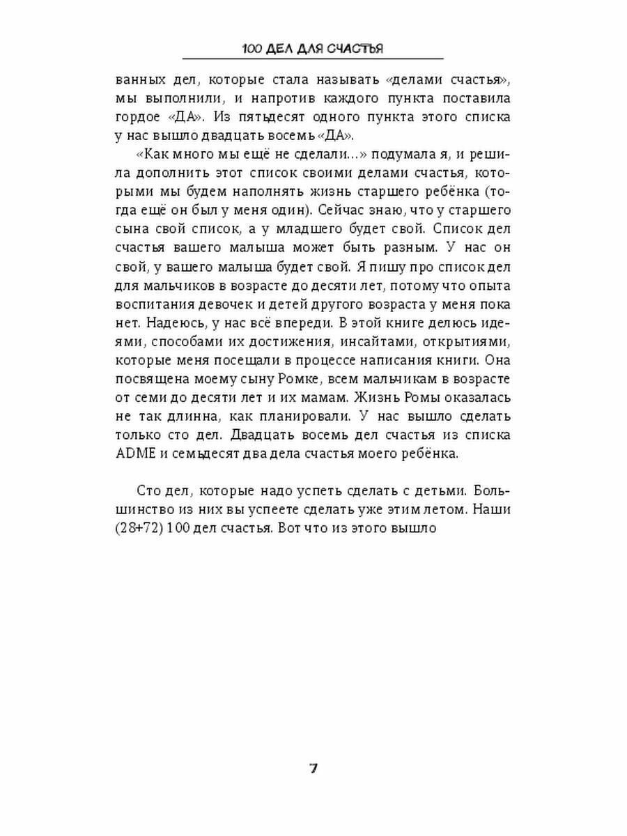 «Сто дел для счастья» – это личная терапия для мам, которая поможет по-новому посмотреть на воспитание мальчиков. Книга показывает, как родители, реализуют свои амбиции за счёт детей, основана на реальных событиях и кричит – давайте любовь, вкладывайте время и любовь в детей. Это самое ценное! Предупреждаем! От книги невозможно оторваться. В каждой главе вы найдёте практические советы, которые помогут ребёнку пополнить копилку счастливых моментов. Читая, вы не сможете сдержать слёз.