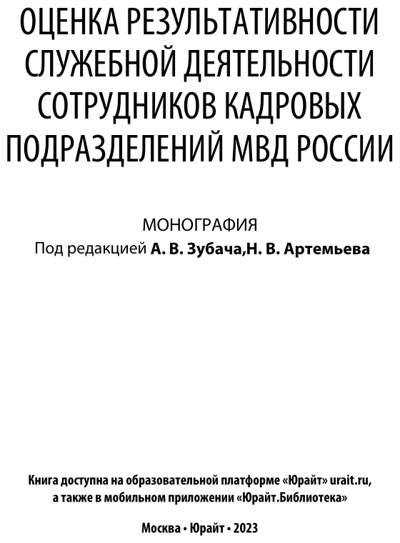 Оценка результативности служебной деятельности сотрудников кадровых подразделений мвд России. Монография (Миронкина Оксана Николаевна; Зубач Анатолий Васильевич; Зырянов Сергей Михайлович; Шурухнова Диана Николаевна; Смородина Виктория Анатольевна; Мамонтов Александр Александрович; Заяев Егор Дмитриевич; Бондарь Елена Олеговна; Бочаров Сергей Николаевич; Василенко Глеб Николаевич; Артемьев; Николай Валентинович); Юрайт, 2019