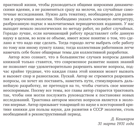 Представленное издание – труд известного зоолога и эколога Даниила Николаевича Кашкарова, одного из основателей отечественной школы экологов. В нем автор поднимает вопросы о серьезности экологических проблем, возможных путях развития, стремится активизировать дальнейшую разработку экологического направления. В книге описано множество тем, которые он пытается трактовать так, чтобы они могли стать руководством к формированию новых исследований. Большое внимание в работе уделено процессам биоценоза. Книга печатается по изданию 1933 года. Для широкого круга читателей.