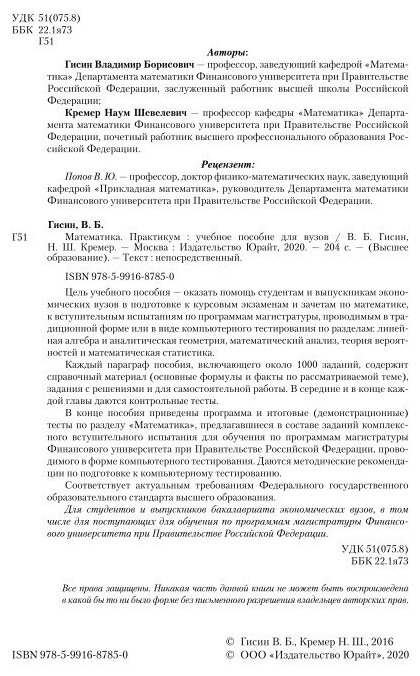 Сервис сравнения цен СкидкаГИД предлагает сравнить цены на товар «Книга: Математика. Практикум. Учебное пособие для бакалавриата и магистратуры (Гисин Владимир Борисович; Кремер Наум Шевелевич); ЮРАЙТ, 2019»