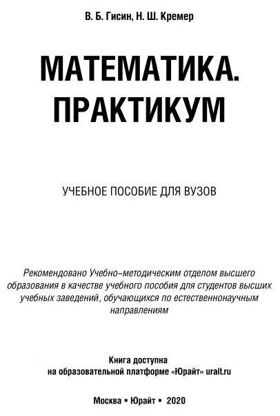 Математика. Практикум. Учебное пособие для бакалавриата и магистратуры (Гисин Владимир Борисович; Кремер Наум Шевелевич); ЮРАЙТ, 2019