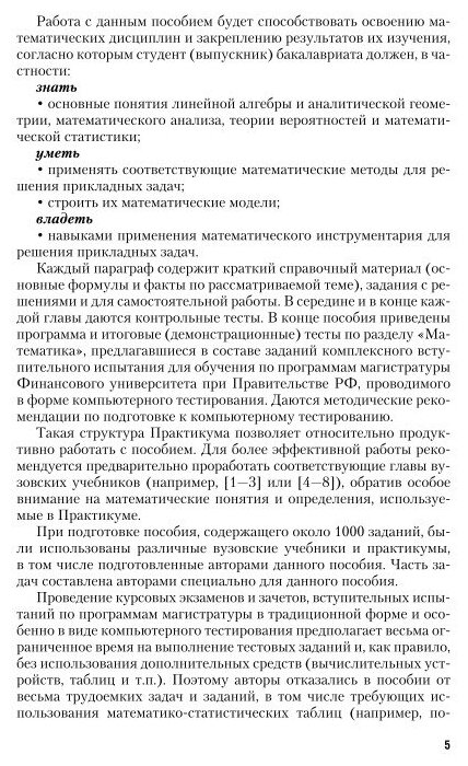 В настоящем практикуме приводятся задания по математике для подготовки студентов и выпускников экономических вузов к курсовым экзаменам и зачетам, к вступительным испытаниям по программам магистратуры, проводимым как в традиционной форме, так и виде компьютерного тестирования по разделам: линейная алгебра и аналитическая геометрия, математический анализ, теория вероятностей и математическая статистика. Каждый параграф содержит краткий справочный материал, примеры с решениями и задания для самостоятельной работы. В середине и в конце каждой главы даются контрольные тесты. В конце пособия приведены программа и итоговые (демонстрационные) тесты по разделу «Математика», предлагавшиеся в составе заданий комплексного вступительного испытания для обучения по программам магистратуры Финансового университета при Правительстве РФ. Даются методические рекомендации по подготовке к компьютерному тестированию.