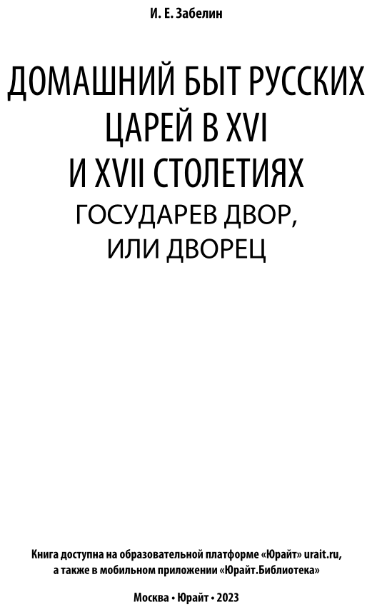 Домашний быт русских царей в XVI и XVII столетиях. Государев двор или дворец (Иван Егорович Забелин); ЮРАЙТ, 2019