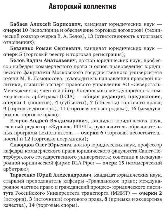 Предлагаемое читателю издание охватывает широкий спектр теоретических и практических вопросов торгового (коммерческого) права, в том числе вопросов о его понятии, месте в системе права и соотношении с правом гражданским, подробно освещаются его историческая эволюция, составляющие и специфика, уделено значительное внимание классификации и сущности торговых договоров, изучаются отдельные, их наиболее распространенные и практически значимые виды, освещаются основные проблемы коммерческого арбитража и международного торгового права. Материал учебного пособия разделен на шестнадцать очерков, содержащих как теоретические (догматические и политико-правовые), так и практические сведения. Содержание не ограничено рамками одной концепции и отличается плюралистичностью представленных позиций. Для студентов, обучающихся по юридическим направлениям, преподавателей и всех интересующихся.