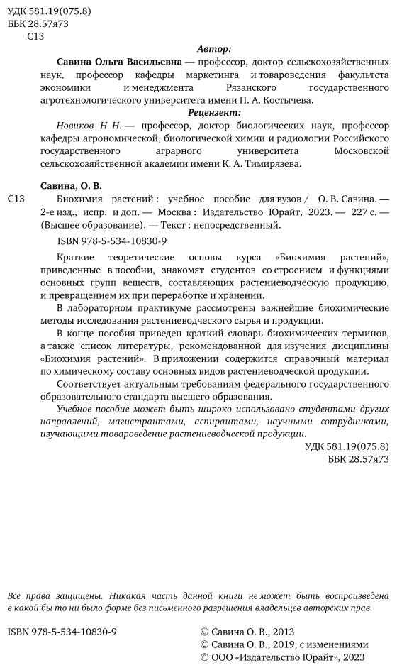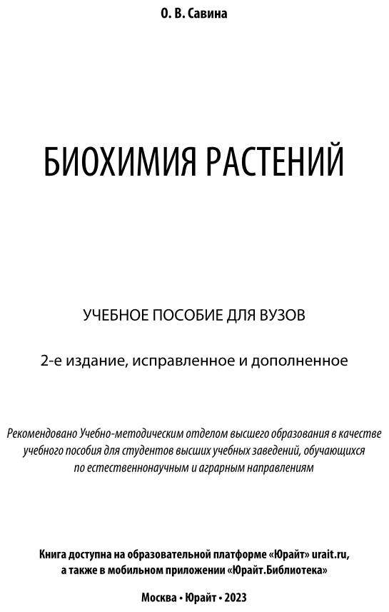 Биохимия растений 2-е изд. испр. и доп. Учебное пособие для академического бакалавриата (Ольга Васильевна Савина); ЮРАЙТ, 2019