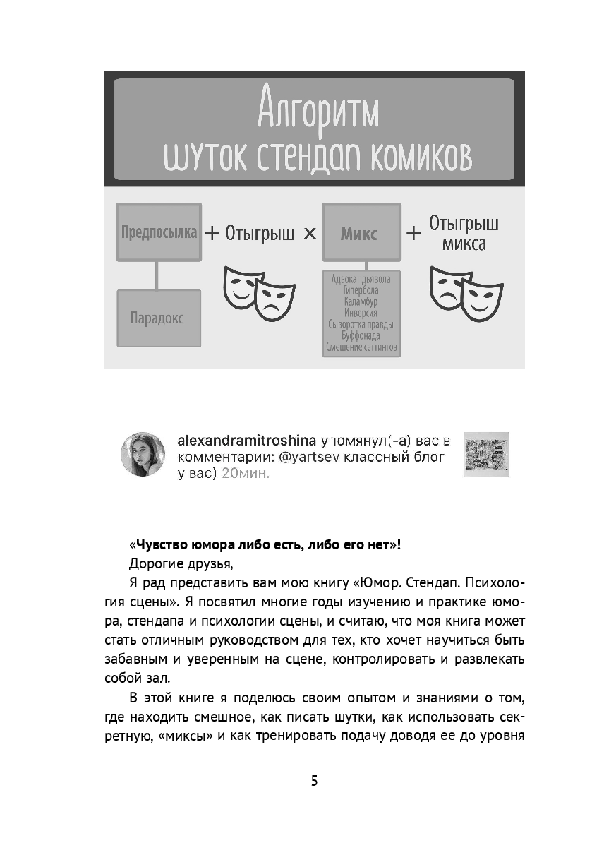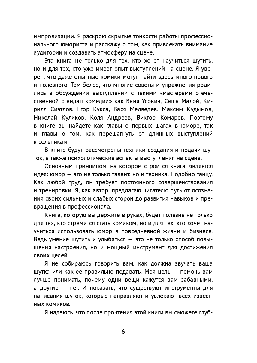 Начните путешествие в мир специфической черты человеческого поведения – в мир юмора. О его психотерапевтическом эффекте, о роли в эволюции и о конкретных приёмах и структурах создания стендапа, как новой формы публичной философии.Как писать стендап, как делать из своих наблюдений юмор, можно ли научиться шутить и как развить чувство юмора. В этой книге собраны конкретные инструменты для построения своей стендап карьеры, ответы на популярные вопросы о юморе и нюансы психологии артистов.