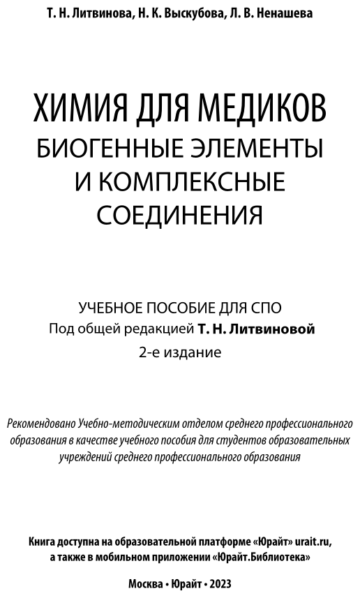 Химия для медиков: биогенные элементы и комплексные соединения 2-е изд. Учебное пособие для СПО (Литвинова Татьяна Николаевна; Выскубова Надежда Константиновна; Ненашева Лариса Владимировна); ЮРАЙТ, 2019