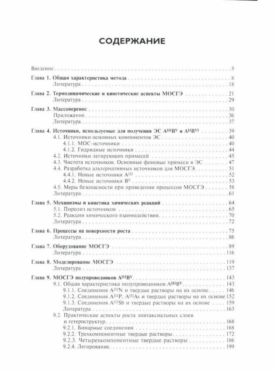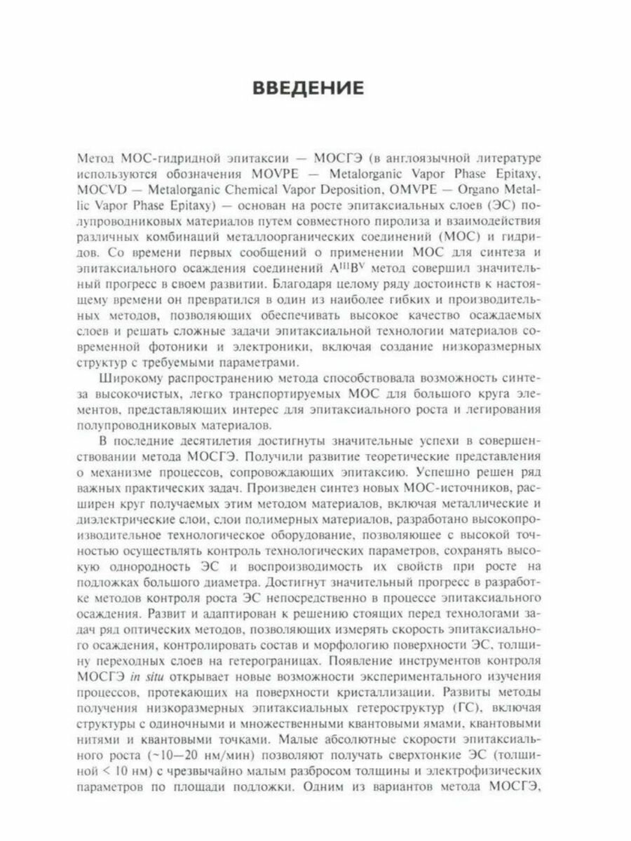 В книге рассмотрены теоретические и практические аспекты МОС-гидридной эпитаксии (МОСГЭ) – одного из наиболее гибких и производительных современных методов получения полупроводниковых структур. Кратко изложены физико-химические основы метода, приведено описание высокопроизводительного технологического оборудования для реализации МОСГЭ и методов контроля роста эпитаксиальных слоев in situ , затронуты вопросы моделирования процессов. Практические аспекты реализации метода подробно рассмотрены на примере формирования эпитаксиальных структур полупроводников AIIIBV, AIIBVI и твердых растворов на их основе – основных материалов современной оптоэлектроники и ИК-техники. Значительное внимание уделено формированию наноразмерных эпитаксиальных структур и гетероструктур на основе нитридов элементов III группы, технология которых получила стремительное развитие в последние годы. Рассмотрены вопросы адаптации метода МОСГЭ к получению ряда новых материалов электронной техники. Книга предназначена специалистам в области технологии полупроводниковых материалов, может быть полезна аспирантам и студентам соответствующих специальностей.