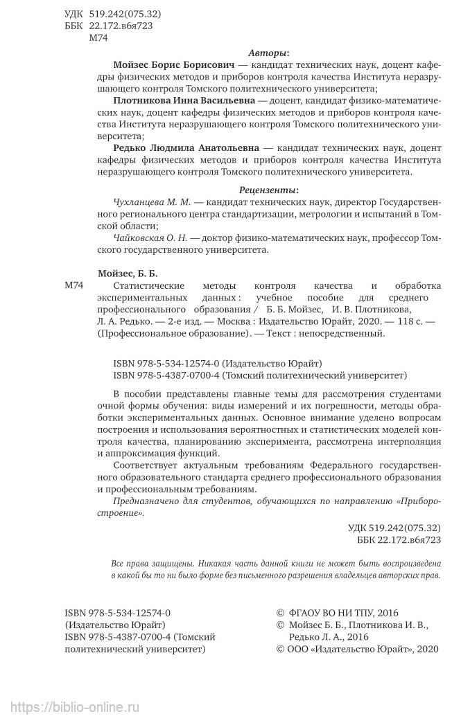 Статистические методы контроля качества и обработка экспериментальных данных 2-е изд. Учебное пособие для СПО (Мойзес Борис Борисович; Плотникова Инна Васильевна; Редько Людмила Анатольевна); ЮРАЙТ, 2022