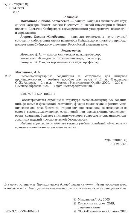 Высокомолекулярные соединения и материалы для пищевой промышленности 2-е изд. Учебное пособие для вузов (Максанова Любовь Алексеевна; Аюрова Оксана Жимбеевна); ЮРАЙТ, 2019