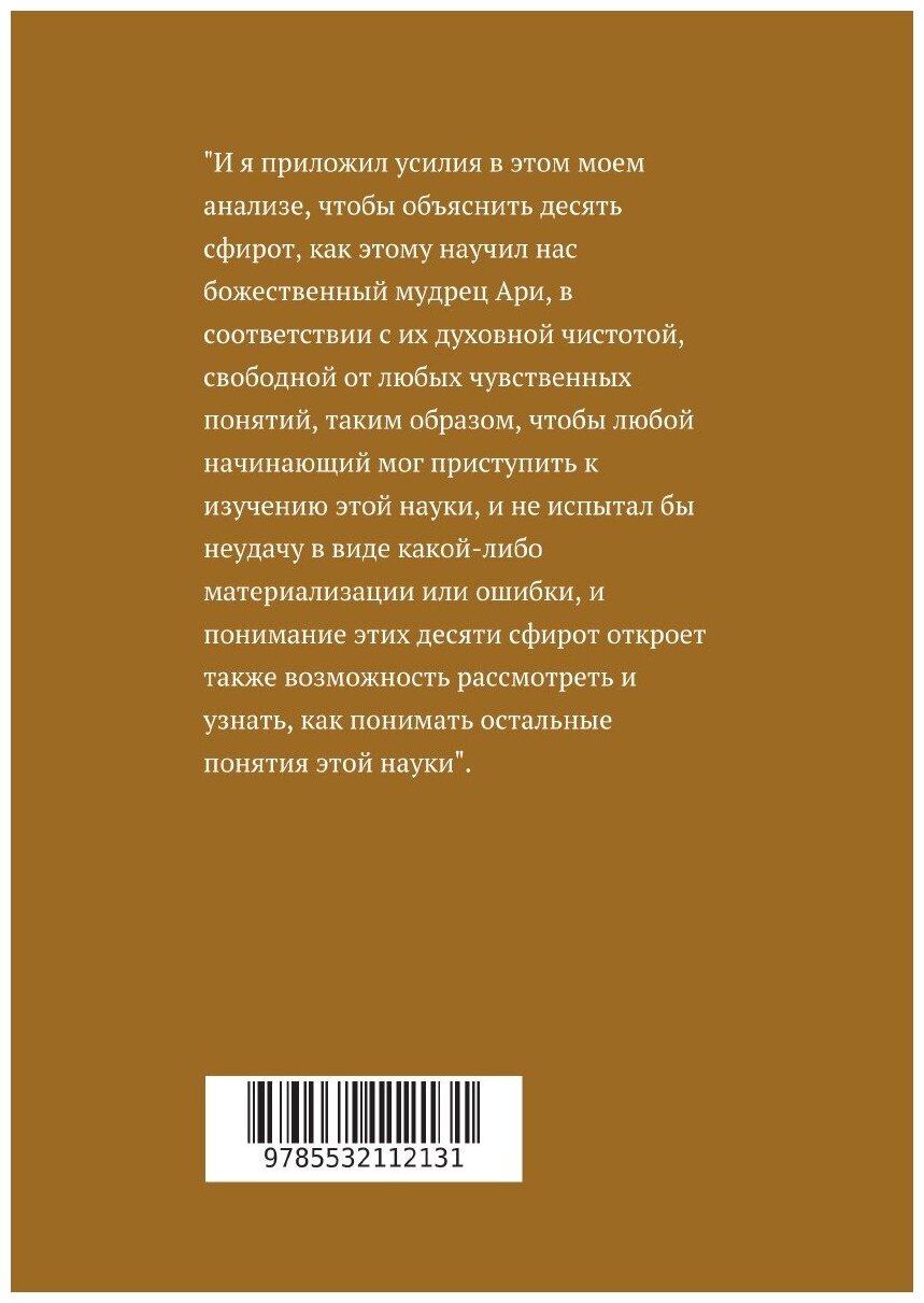 "И я приложил усилия в этом моем анализе, чтобы объяснить десять сфирот, как этому научил нас божественный мудрец Ари, в соответствии с их духовной чистотой, свободной от любых чувственных понятий, таким образом, чтобы любой начинающий мог приступить к изучению этой науки, и не испытал бы неудачу в виде какой-либо материализации или ошибки, и понимание этих десяти сфирот откроет также возможность рассмотреть и узнать, как понимать остальные понятия этой науки".