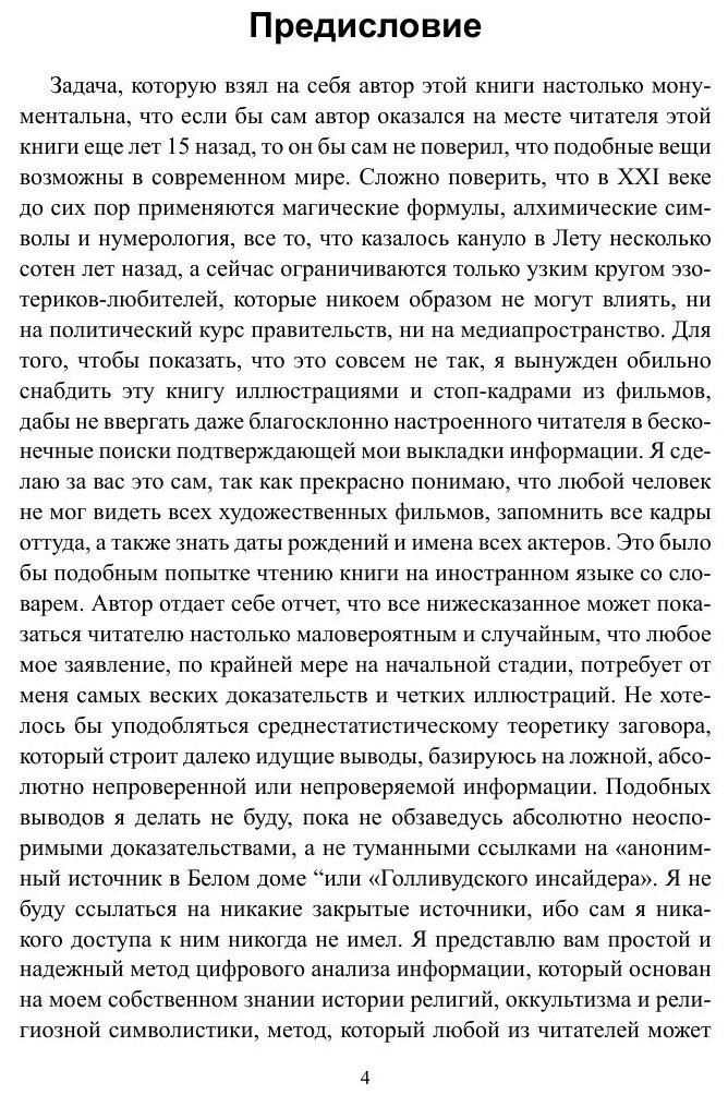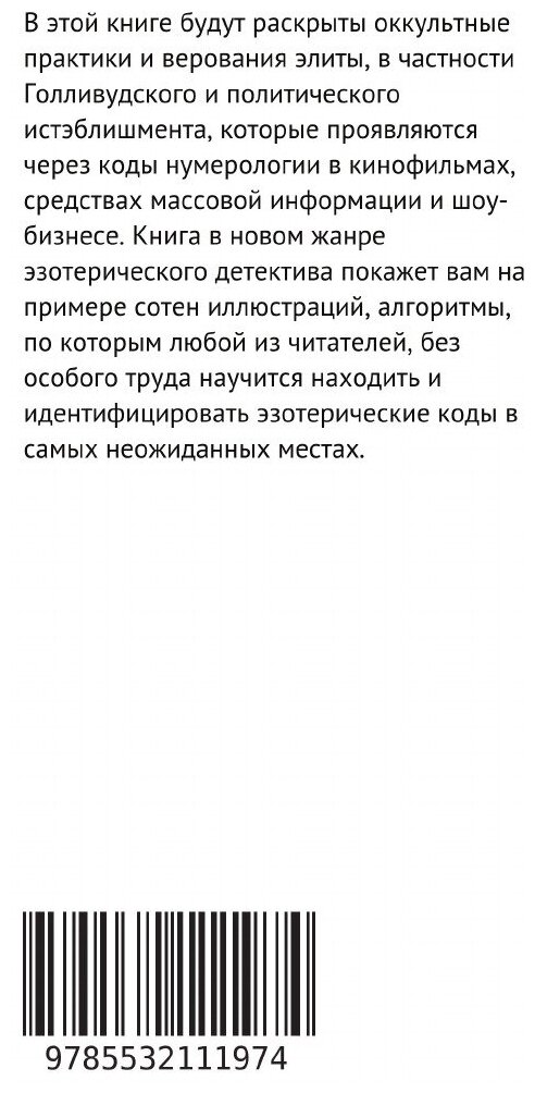 В этой книге будут раскрыты оккультные практики и верования элиты, в частности Голливудского и политического истэблишмента, которые проявляются через коды нумерологии в кинофильмах, средствах массовой информации и шоу-бизнесе. Книга в новом жанре эзотерического детектива покажет вам на примере сотен иллюстраций, алгоритмы, по которым любой из читателей, без особого труда научится находить и идентифицировать эзотерические коды в самых неожиданных местах.