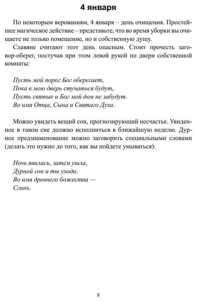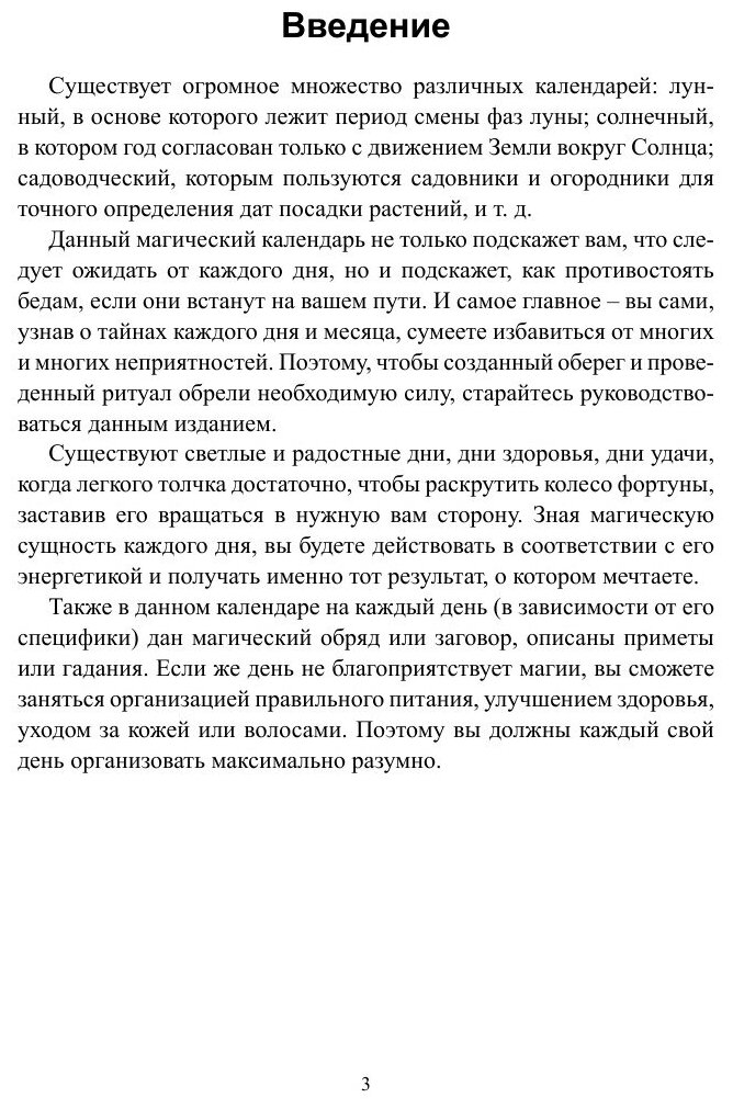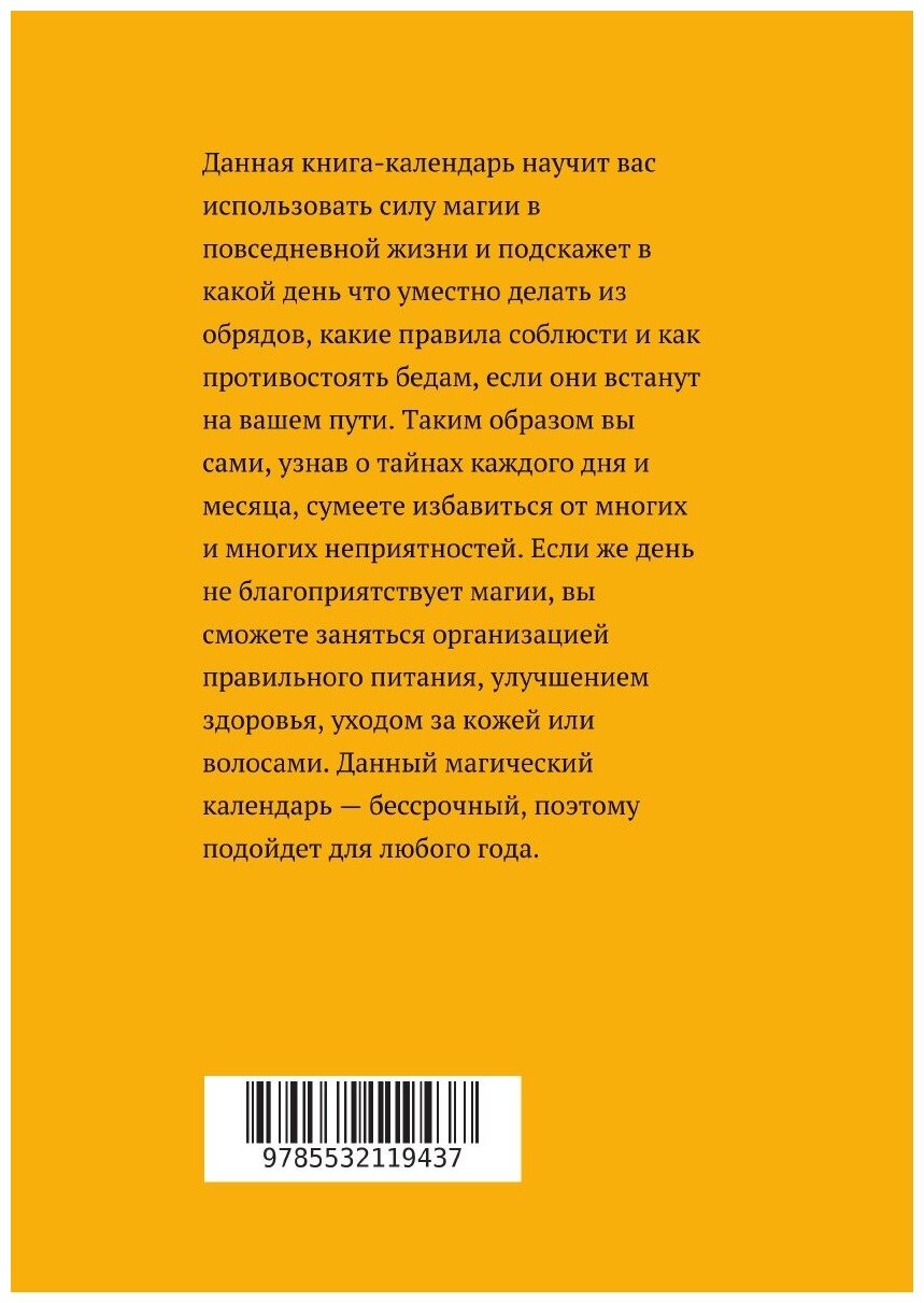 Данная книга-календарь научит вас использовать силу магии в повседневной жизни и подскажет в какой день что уместно делать из обрядов, какие правила соблюсти и как противостоять бедам, если они встанут на вашем пути. Таким образом вы сами, узнав о тайнах каждого дня и месяца, сумеете избавиться от многих и многих неприятностей. Если же день не благоприятствует магии, вы сможете заняться организацией правильного питания, улучшением здоровья, уходом за кожей или волосами. Данный магический календарь – бессрочный, поэтому подойдет для любого года.