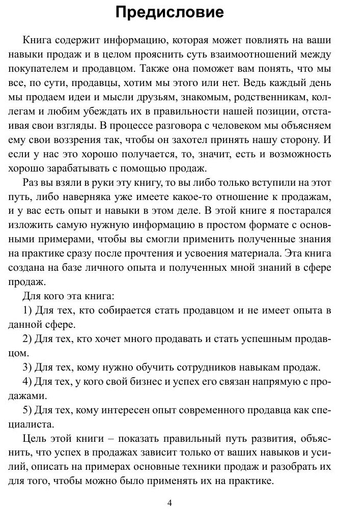 Данная книга содержит всю необходимую информацию, для того чтобы стать успешным продавцом в современном мире. Это рекомендации и примеры. Разбор основных навыков и знаний, необходимых в сфере продаж. Если вы хотите зарабатывать много денег, то вам просто необходимо стать профессионалом своего дела. Используйте эту книгу как учебник, перечитывайте нужные главы и применяйте знания на практике. И тогда вы увидите что все это работает. Так как вся информация и знания изложенные в этой книге получены мной в результате длительной работы в продажах и моих личных изысканиях в области самосовершенствования.