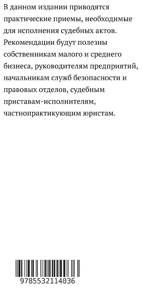 В данном издании приводятся практические приемы, необходимые для исполнения судебных актов. Рекомендации будут полезны собственникам малого и среднего бизнеса, руководителям предприятий, начальникам служб безопасности и правовых отделов, судебным приставам-исполнителям, частнопрактикующим юристам.