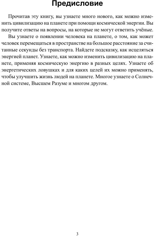 Прочитав эту книгу, вы узнаете много нового, как можно изменить цивилизацию на планете при помощи космической энергии. Вы получите ответы на вопросы, на которые не могут ответить учёные.Вы узнаете о появлении человека на планете, о том, как может человек перемещаться в пространстве на большое расстояние за считанные секунды без транспорта. Найдете подсказку, как исцеляться энергией планет. Узнаете, как можно изменить цивилизацию на планете, применяя космическую энергию в разных целях. Узнаете об энергетических ловушках и для каких целей их можно применять, чтобы улучшить жизнь людей на планете.