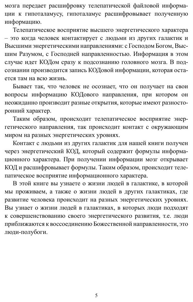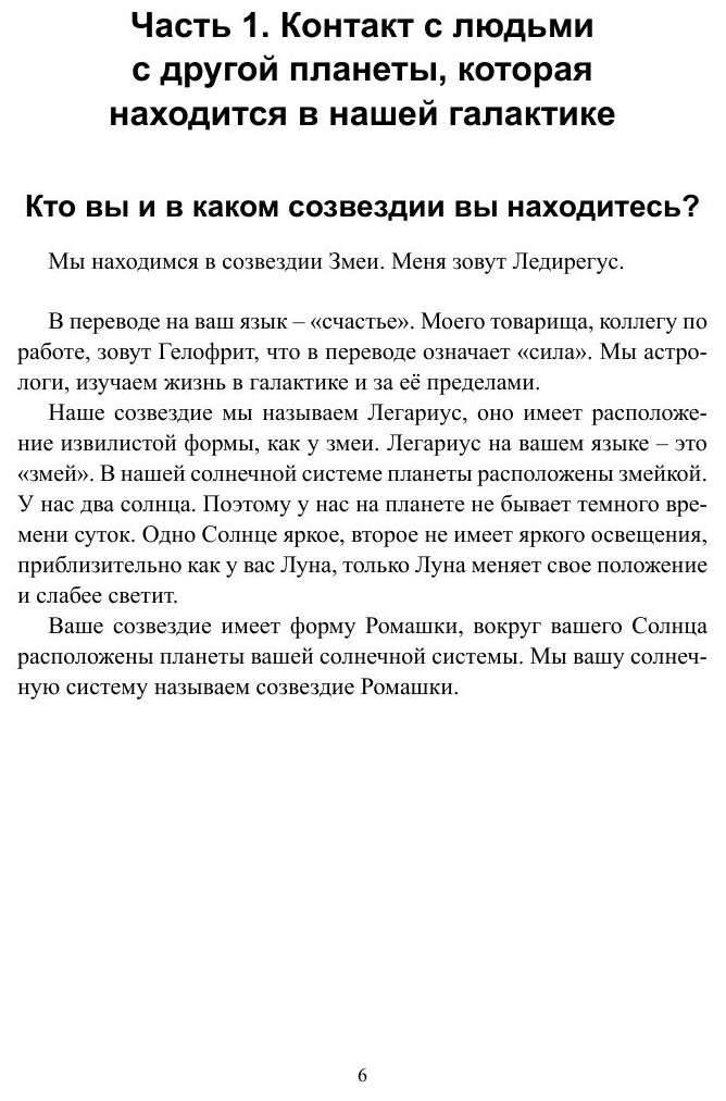 Книга написана при помощи телепатического контакта с людьми из разных галактик, которым задавались разные вопросы, и они на них отвечали.От людей из разных галактик вы многое узнаете и поймете, для чего дана жизнь человеку, как он ее должен пройти и какого совершенства человек может достигнуть при развитии.Люди из созвездия Змеи вам многое расскажут о своей цивилизации и о быте. Созвездие Змеи находится в нашей галактике.Расскажут вам, как они перемещаются с одной галактики в другую, историю нашей планеты и многое другое…